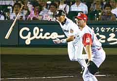 ヒットを打ち打点も稼いだから、ここらへんで派手な一発狙い「おもっきりホームランを狙って打っちゃいます打法」でバックスクリーンに放った特大の祝打! 天才打者・今岡にしか出来ない水島新司の漫画のような独特の反りかえり打法。(w