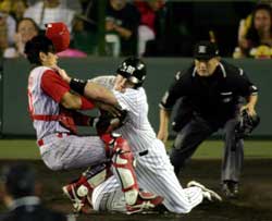 ところで矢野の頭部に死球! 甲子園に緊張が走る・・・。 矢野は自力で立ち上がったものの大事をとって途中交代。 そして、その直後のクロスプレーで鯉さんチームの倉捕手が運の悪いことによりによってテリーマン・スペンサーの得意技「テキサス・クローバー・ホールド」の攻撃を食らって救急車で病院直行。 目には目をってことじゃないだろうが、タイミング的にはアウトではあったが、あの位置で捕球してベースの前でブロックすれば体当たりされてもしょうがない当然のプレーだとオイラは思う。