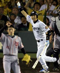 そして延長12回、これで負けはナシの展開になる。 「きょうはドローかな~っ」とあきらめではないがちょっと弱気ムードを打ち砕いた逆転を呼ぶ男・レットスター赤星~! この執念が勝利を引き寄せたと言っても過言じゃないだろう。 赤星は「走るぞ~ 走るぞ~」っとオレ竜バッテリーを揺さぶる。 ここで得点圏にランナーを進めたくないと必要以上に警戒させピッチングの集中力を削ぐ、まさにナイス・足スト。 キャッチャー谷繁も交流戦前の非力な鳥谷のイメージしかなかったのであろう「速い球についてこれない」っと全球ストレートを投げさせる。 絶好調現在進行形・鳥谷は迷わずストレート一本にしぼってフルスイング~! カキーーーン ビューーー ウワァァァーー!(効果音)